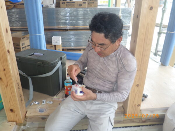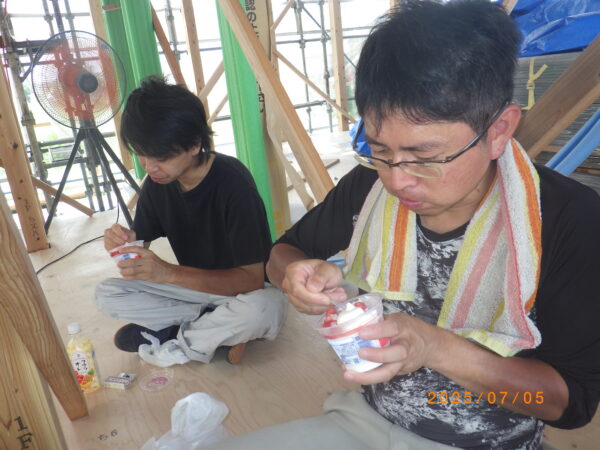 休憩時間も塩飴をT棟梁他大工さんらに配布しながら